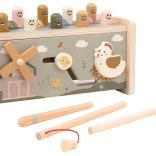 Opdag et sjovt trælegetøj, der kombinerer hammerbænk, magnetisk fiskeri, tandhjul, roterende propel, skydelabyrint med kylling og en farverig xylofon. Dette multifunktionelle sæt i pastelfarver understøtter finmotorik, hånd-øje-koordination, logisk tænkning og sansemotorik og underholder børn i timevis.