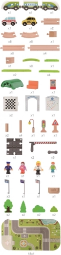 Denne træ togbane giver børn et rigt legeunivers, hvor der opstår en ny historie hver dag. Der medfølger tog med tre vogne, station, løftebom, taxa, ambulance, trafiklys, færdselsskilte, træer og menneskefigurer. Det hele suppleres af en trykt måtte med gader og overgange, som gør både opbygning og leg mere overskuelig.