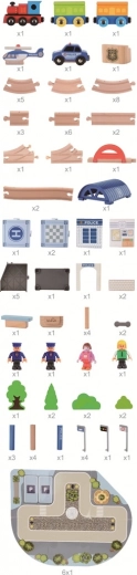 Denne moderne træ togbane med temaet travl storby giver børn alt, hvad de behøver til mange timers fantasifuld leg. Sættet indeholder et blåt tog med tre vogne, varierede skinner inklusive en hævet overføring og en rummelig station med halvtag. Politibil, figurer, trafikskilte, lamper, træer og andet tilbehør skaber stemningen af en rigtig by.