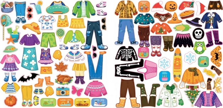 Magnetisk påklædning Familie er et kreativt sæt, hvor børn designer tøj til mor, far, datter og søn. Med et bredt udvalg af tøj og accessories kan de skabe outfits til sommer, efterår, vinter og forår og løse sjove opgaver fra temakortene. Den praktiske magnetiske trækasse med drejelig tavle fungerer både som spilleflade og opbevaring, så legen altid er klar til at komme med på tur.