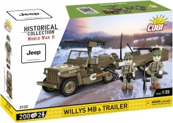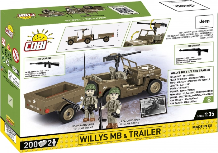 Den legendariske terrængående bil fra Anden Verdenskrig vækkes til live i COBI-byggesættet: Jeep WILLYS MB med trailer. Modellen udmærker sig ved autentiske former, militær bemaling og et sæt tilbehør, inklusive drejeligt maskingevær, værktøj og våben til figurerne. Takket være klodser af høj kvalitet er modellen stabil og egnet til intensiv leg såvel som udstilling i montre.
