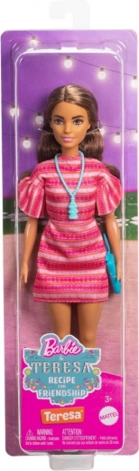 Dukken Teresa ser ud præcis som i filmen BARBIE og TERESA: Opskrift på venskab – hun har en lyserød mønstret kjole med flæseærmer, hvide sko og iøjnefaldende turkise accessories. Takket være det detaljerede design af tøj og makeup er hun klar til ethvert modeeventyr.