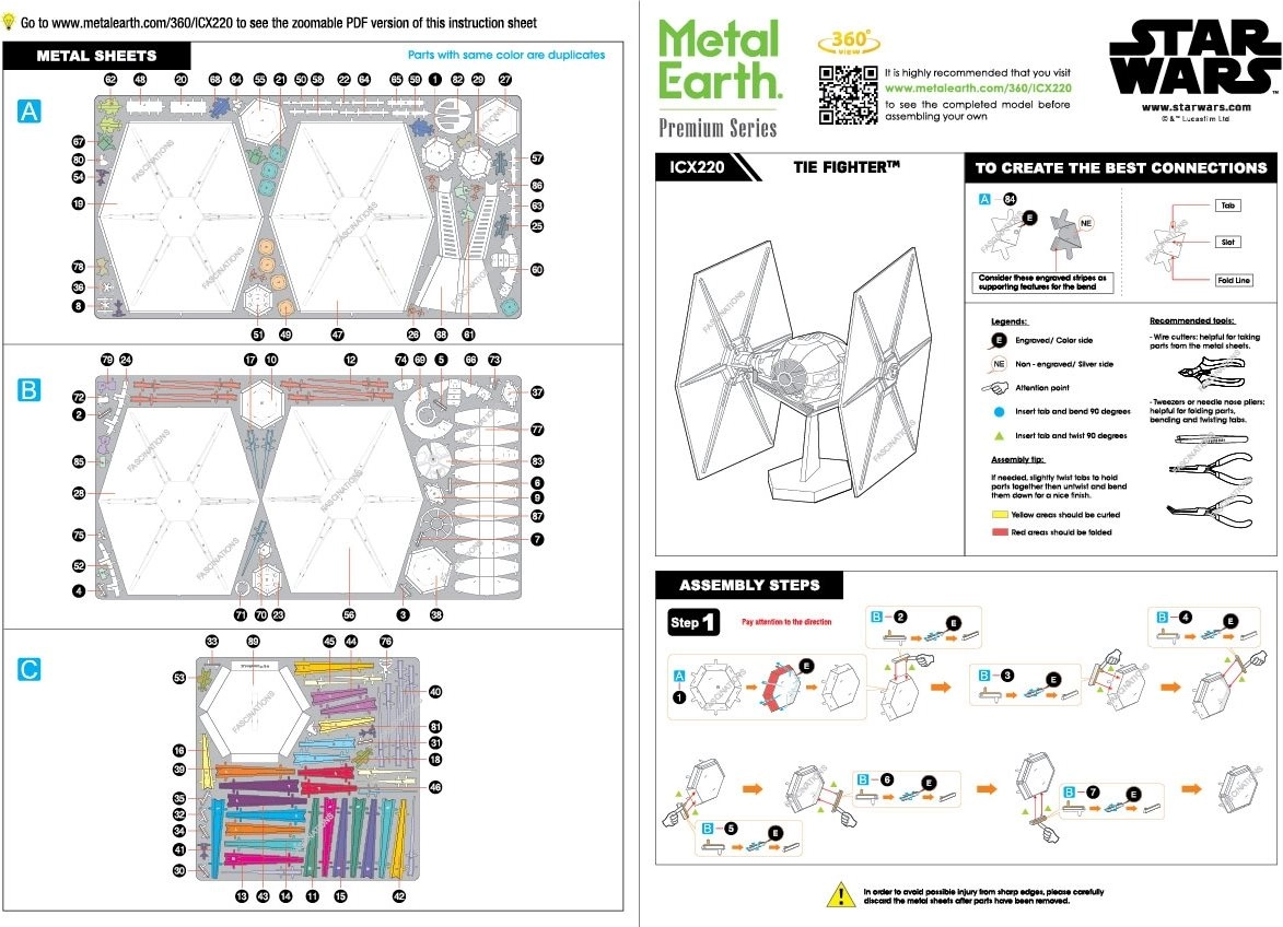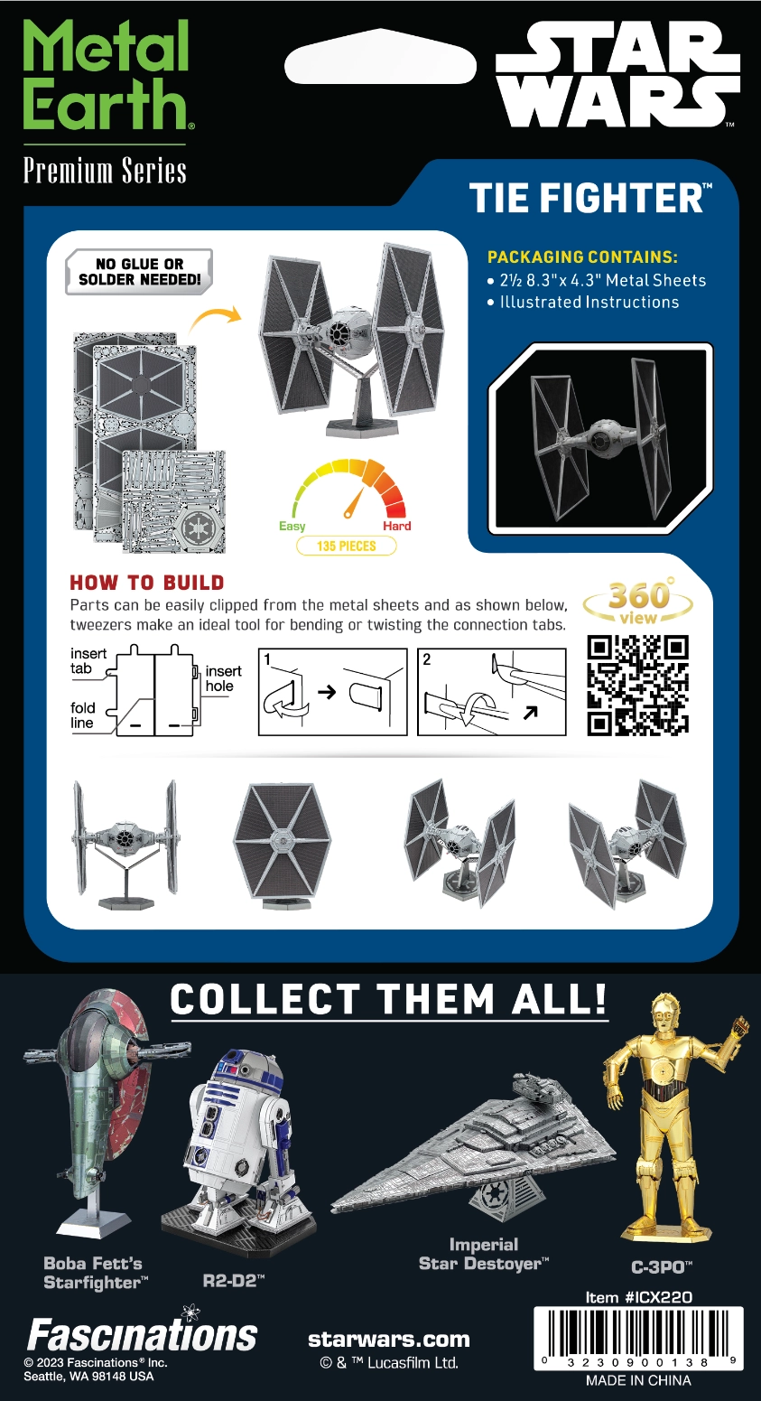 Skab din egen metalmodel af den legendariske jager TIE Fighter fra Star Wars-universet. Af flade stålplader samler du ved hjælp af gennemtænkte låse og præcis lasergravering en imponerende 3D-model, der tager sig flot ud på hylden eller skrivebordet.