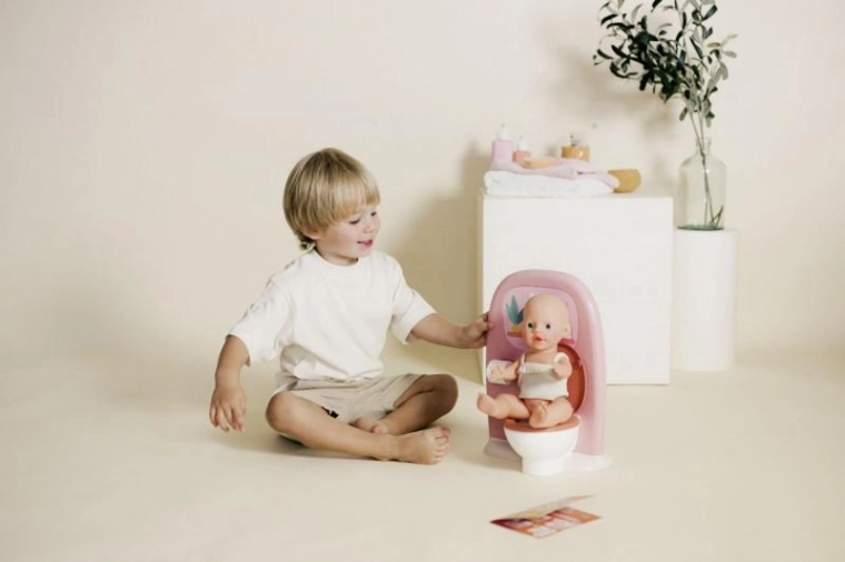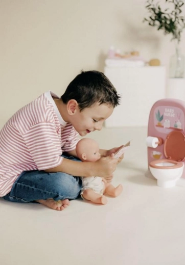 Et stilfuldt badeværelsessæt til dukker fra serien Baby Nurse, som indeholder alt, hvad der er brug for til den daglige pleje. Sættet omfatter en toilet, håndvask med spejl, rulle toiletpapir samt tilbehør som tandbørste og kop. Velegnet til dukker op til 42 cm og fremstillet af mindst 75 % genanvendt materiale.