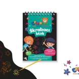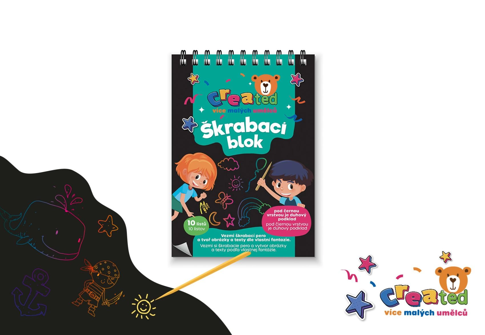 Dette kreative sæt vækker fantasien hos både børn og voksne. Under det sorte lag gemmer der sig en strålende regnbuebaggrund, som smukt kommer frem ved hvert ridse. Perfekt til fri tegning, at skrive beskeder, dekorationer eller originale hilsner.