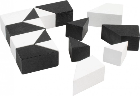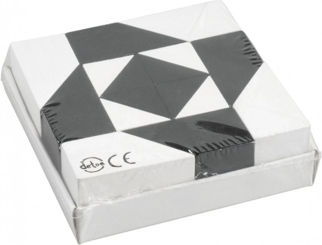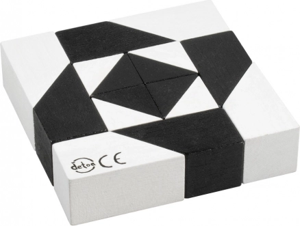 Det sorte/hvide tangram fra Detoa byder på utallige kombinationer og måder at lægge brikkerne på. Opgaven er at samle de enkelte træbrikker til en form efter en skabelon – der er dog flere løsninger, så legen forbliver sjov, selv når den gentages. De enkle regler gør det til et godt valg for både børn og voksne.