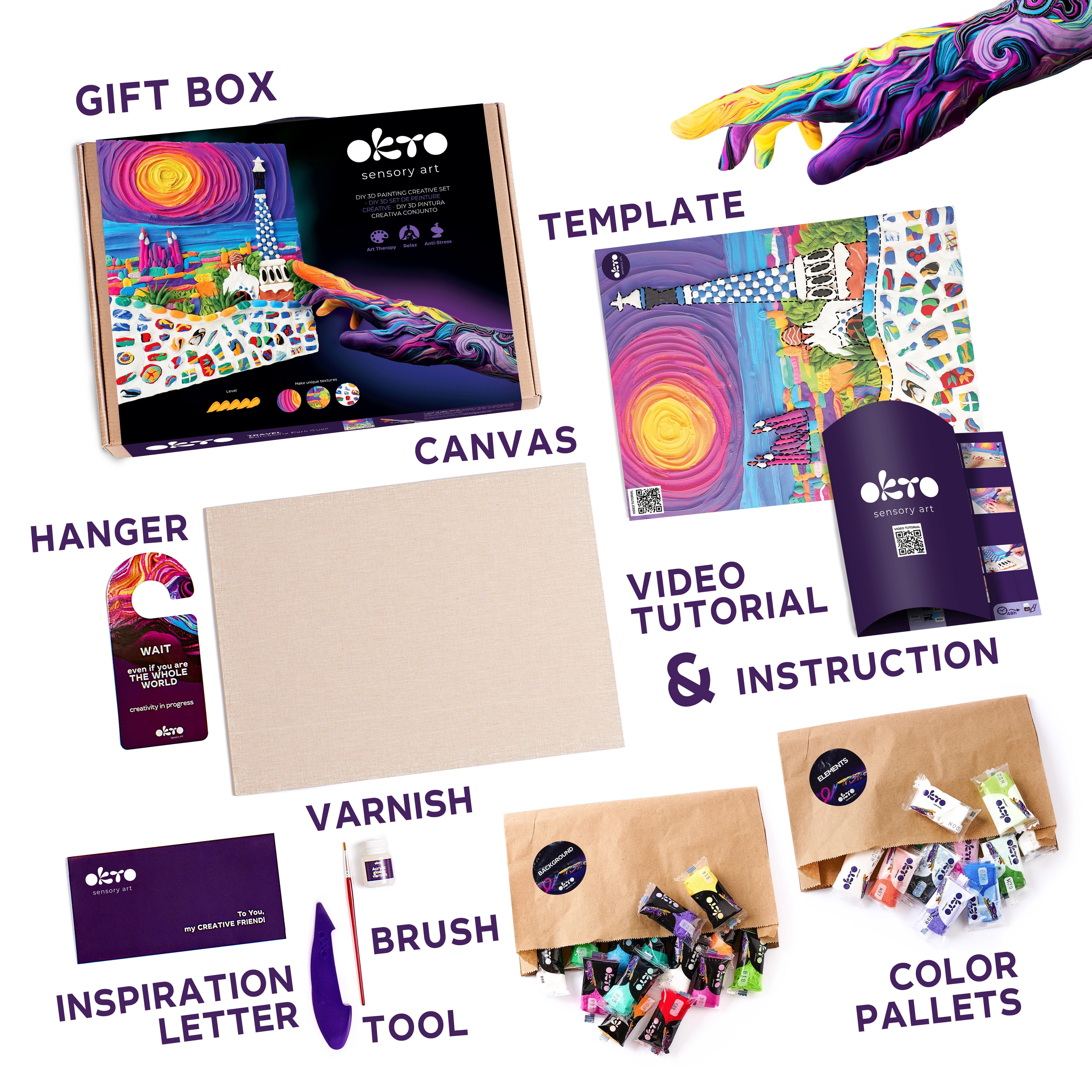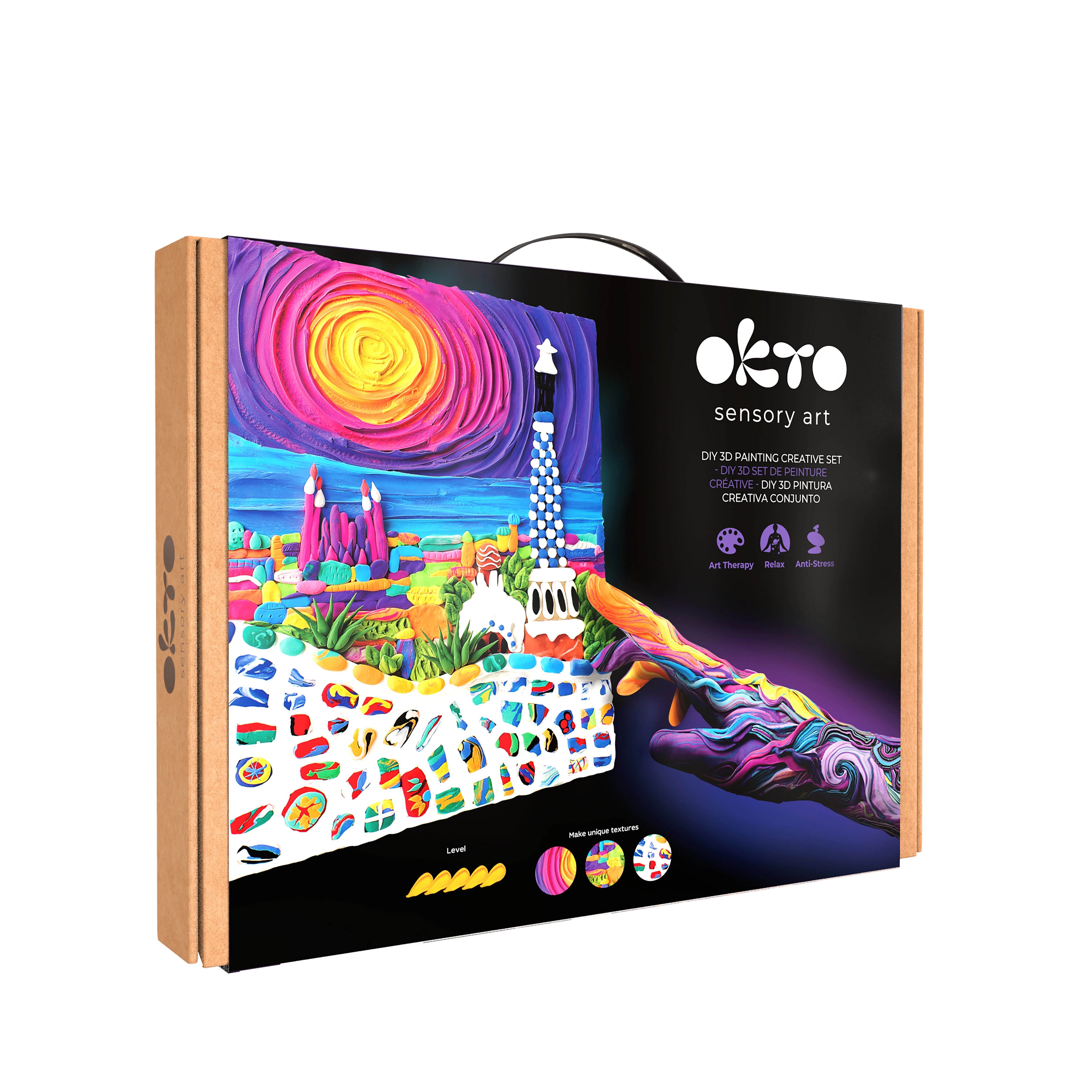 Dette premium kreative OKTO-sæt gør det muligt at skabe et plastisk billede med unik tekstur og legende detaljer inspireret af Barcelonas arkitektur. Takket være den selvhærdende modelleringsmasse opnår du en imponerende 3D-effekt, som fremhæves og beskyttes langvarigt efter lakering med akryllak.