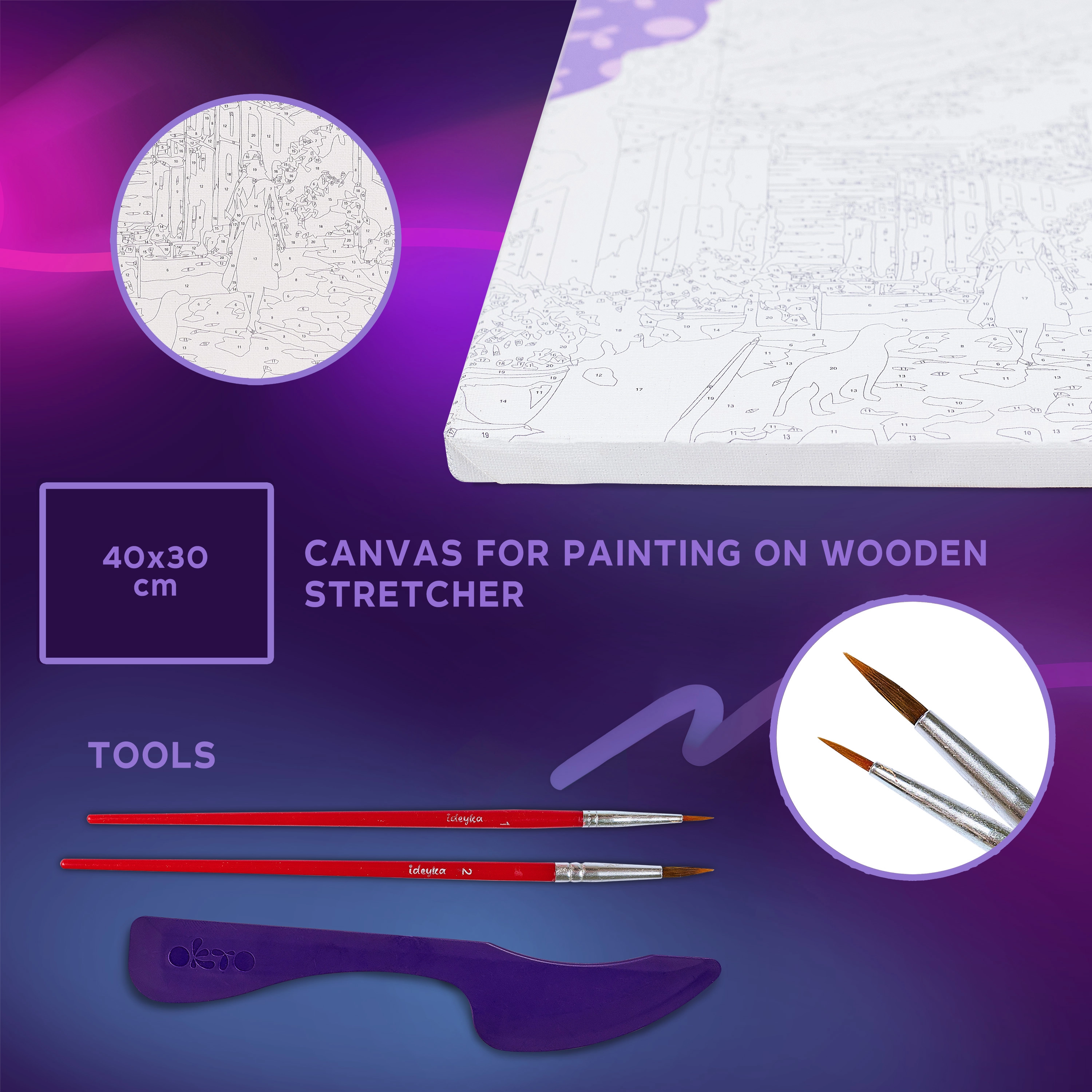 Pakken indeholder alt, hvad du behøver til at skabe – fra fortrykt lærred og farver til modelleringsmasse og værktøjer. Fremgangsmåden er enkel og kan håndteres selv af helt nye begyndere.