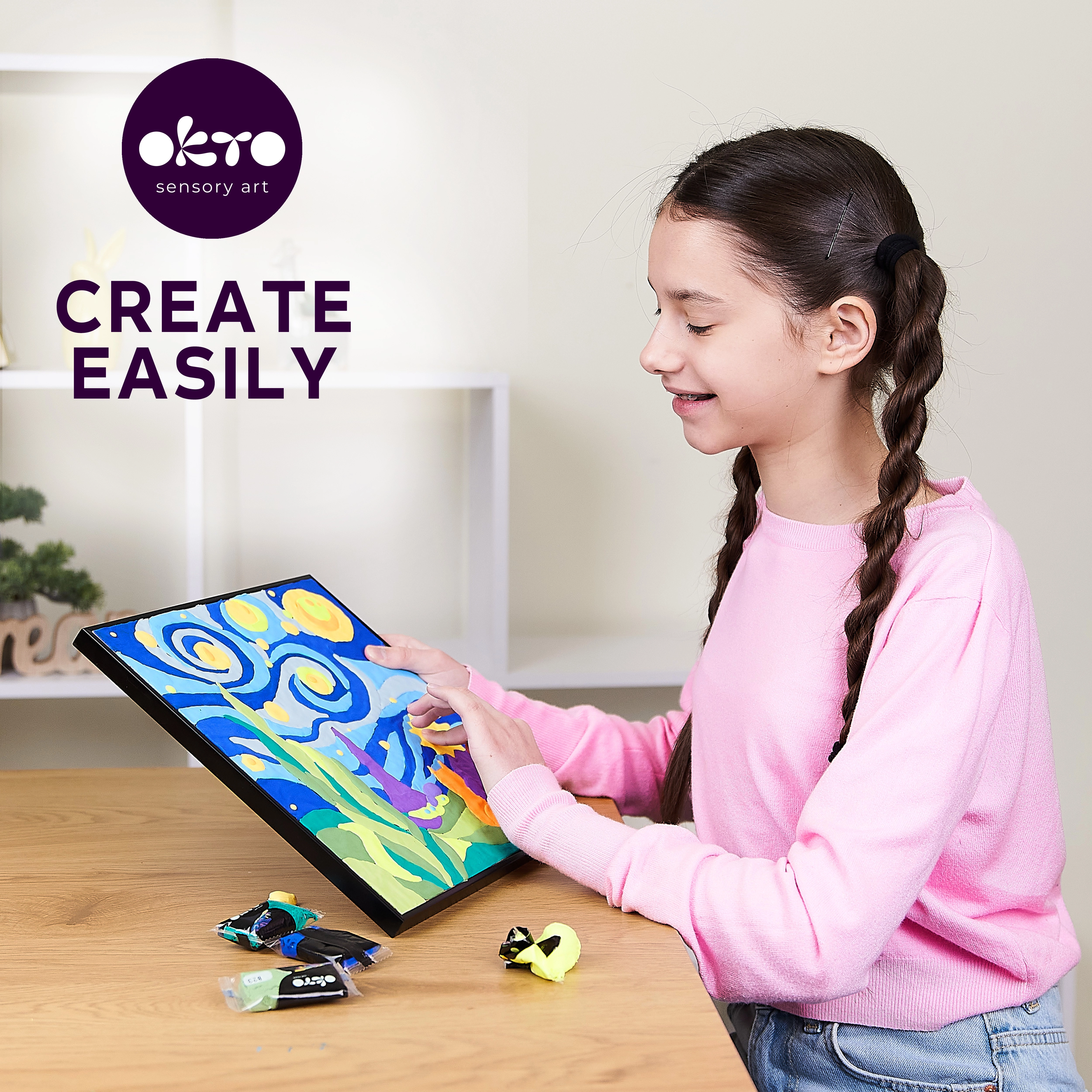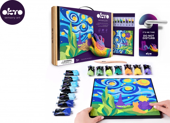 I pakken finder du alt, hvad du behøver – lærred 29 × 29 cm, billedvejledning, modelleringsværktøj og et sæt med 14 farvede formbare masser. Følg blot tallene, form og påfør massen på de markerede felter. Det færdige billede egner sig perfekt som dekoration på børneværelset eller som en original gave.