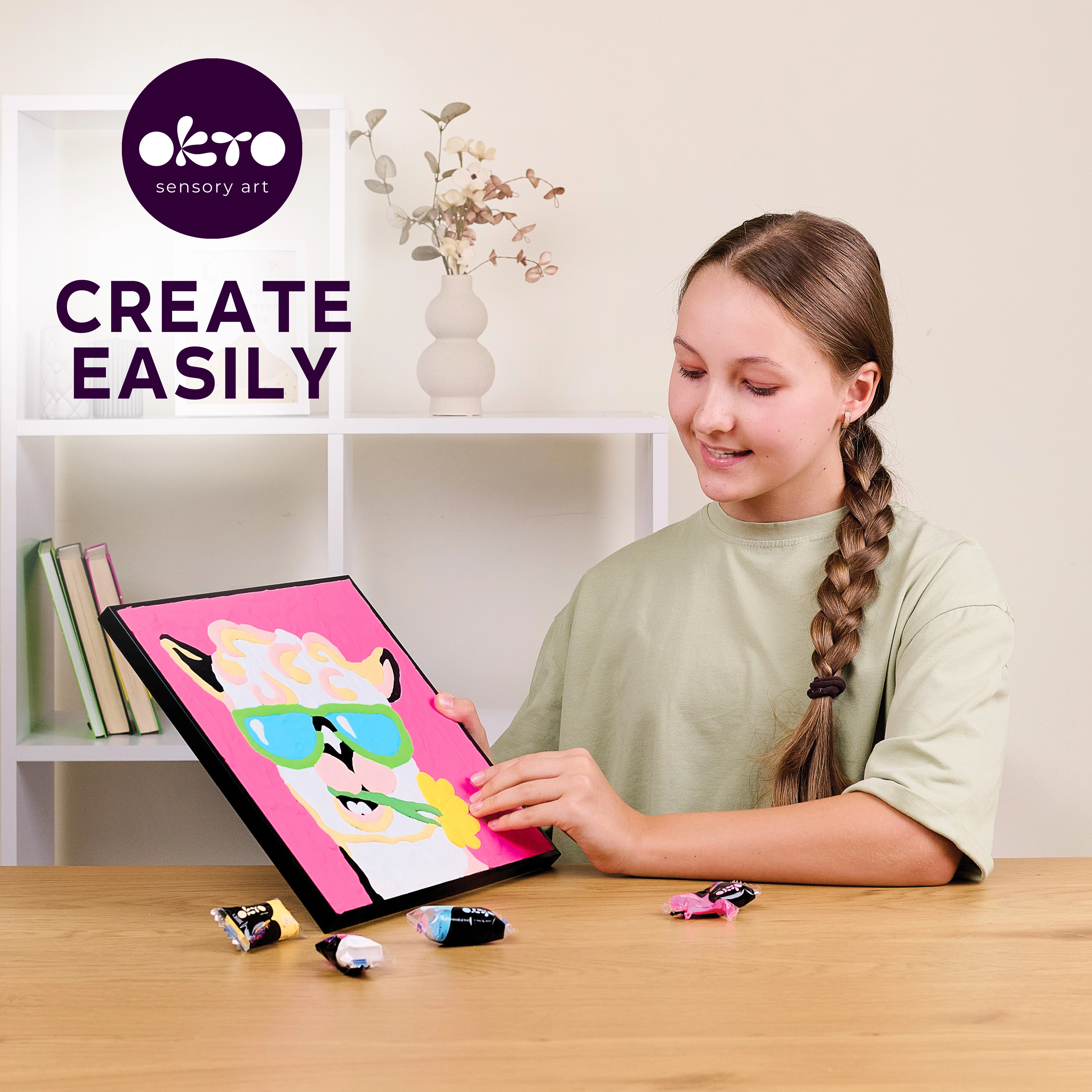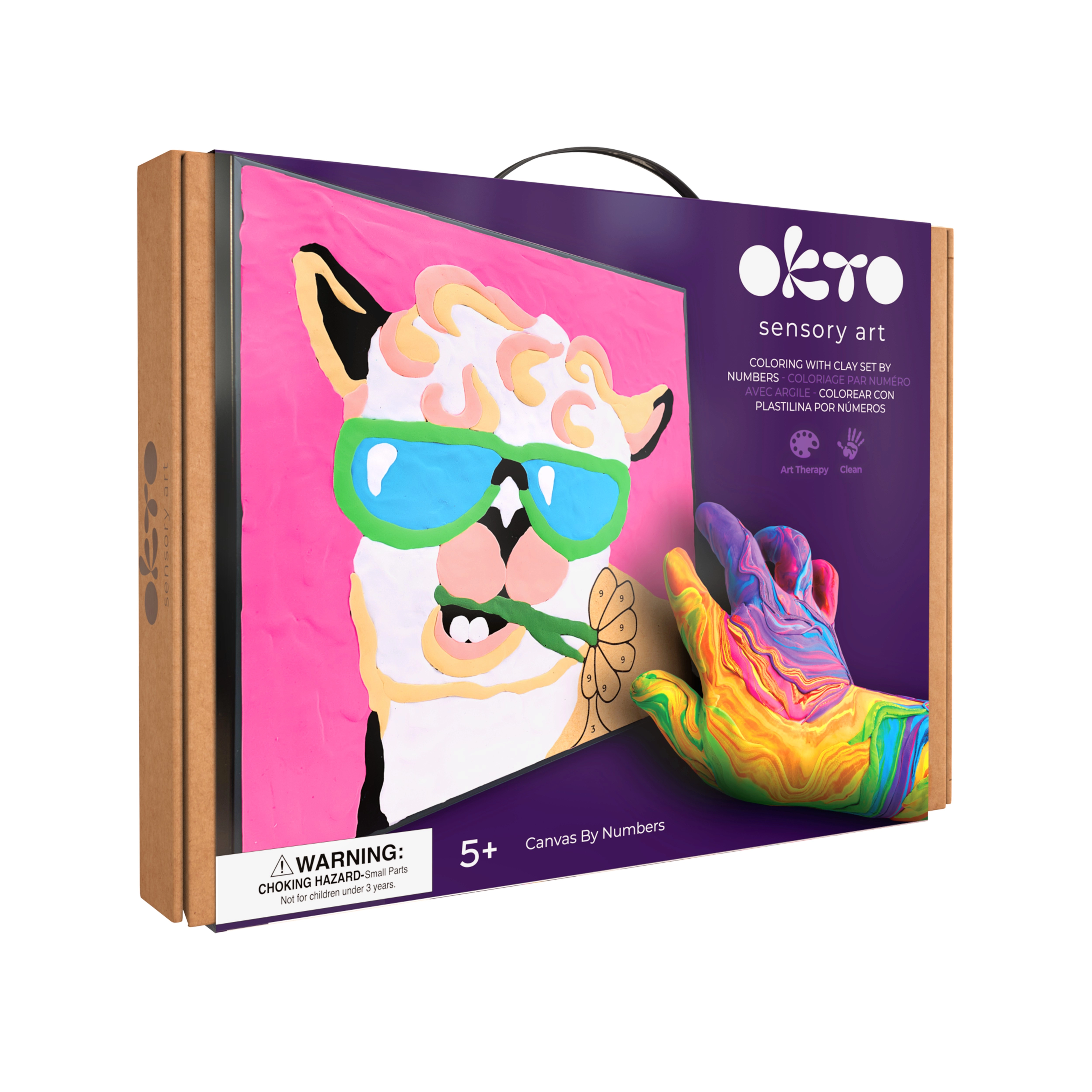 - Komplet sæt – inkluderer lærred, billedvejledning, modelleringsværktøj og 14 stk. farvede formbare masser.