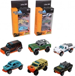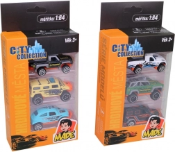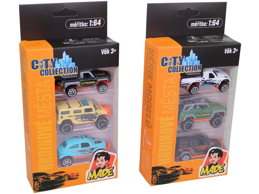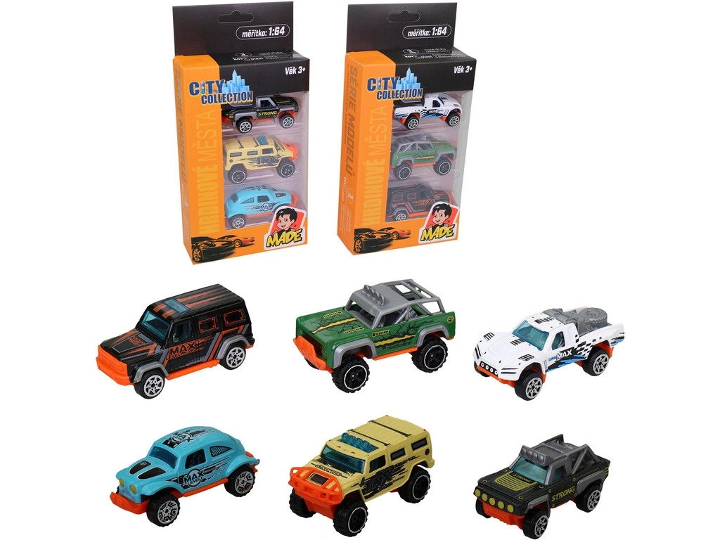 Dette sæt bringer tre detaljerede biler i den populære 1:64-skala, ideelle til racerløb derhjemme og til at udvide samlingen. Den robuste kombination af metal og plast sikrer lang holdbarhed og et flot udseende.