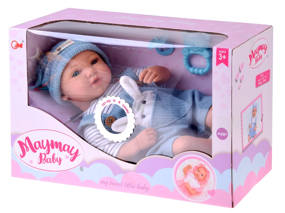 Lydmodulet afspiller latter, pludren, snorken, “mor”, gråd, nysen, “far”, hoste og hikke. CR2032-batterier er inkluderet.