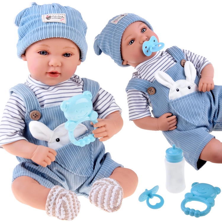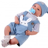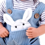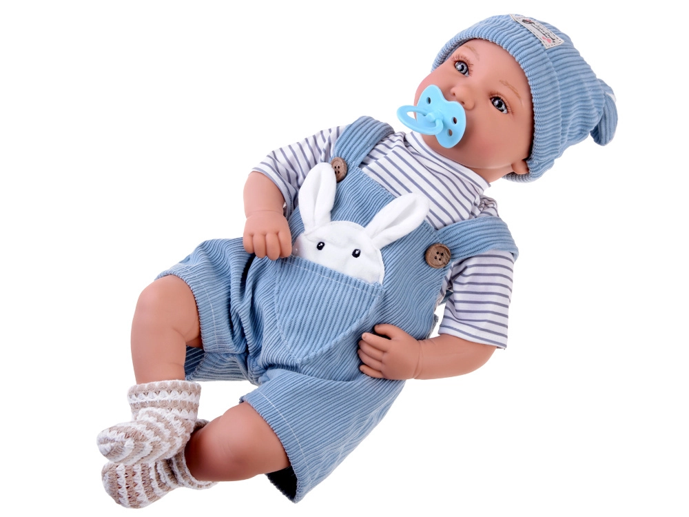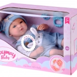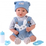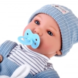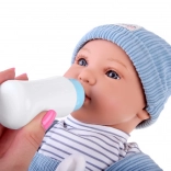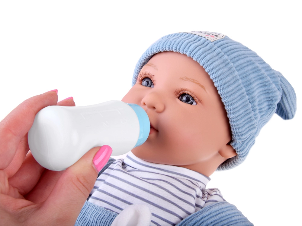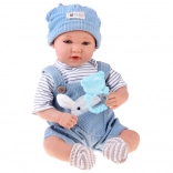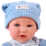 Den interaktive babydukke imponerer med realistiske ansigtstræk, lange øjenvipper og markante øjne. Den har en blød krop for nemme kram og en plast-hoved samt lemmer, der tåler daglig leg. Det stilfulde outfit i blå manchester passer perfekt til den stribede T-shirt og den strikkede hue.
