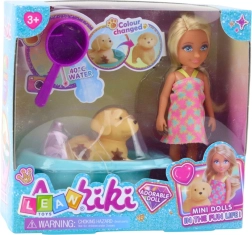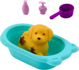 Sødt sæt til små omsorgsgivere: dukke, hund og badetilbehør. Den største attraktion er den interaktive hund, hvor brune pletter forsvinder, når den kommer i kontakt med vand. Sættet indeholder en badebalje med “bruser” og kosmetisk tilbehør til realistisk rolleleg, der udvikler finmotorik og ansvarsfølelse.