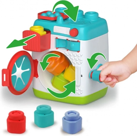 - Underholdende mekanik: det drejelige hjul “centrifugerer” klodserne inde i vaskemaskinen.