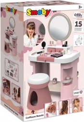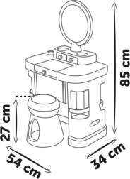 Sættet indeholder 15 stykker tilbehør – fra “læbestifter” med mekanisk funktion til neglelakker og øjenskyggepalette samt kam, børste og ring. Alle kosmetiske elementer er kun imitationer, så legen er sikker og egnet til børn. Konstruktionen fremstillet ved blæseformning sikrer høj stivhed og lang levetid. Derudover kan toiletbordet nemt bygges om til en bordvariant for at spare plads.