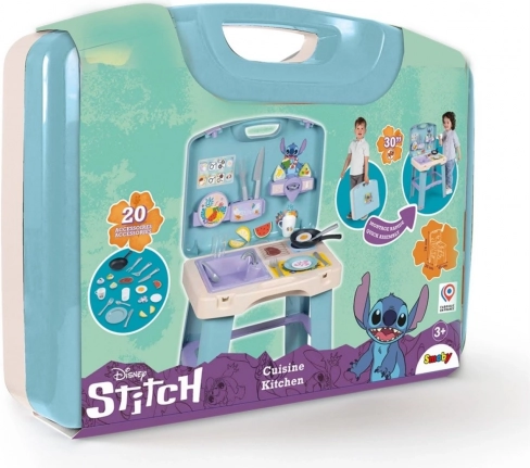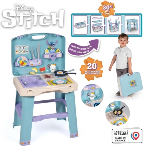 Oplev glæden ved at lave mad med det mobile køkken SMOBY STITCH, som passer i en praktisk kuffert og kan foldes ud på et øjeblik uden skruer. Takket være de kompakte mål, det farverige Disney-design med STITCH og det rige tilbehør er det ideelt til kreativ rolleleg som kok både hjemme og på farten.