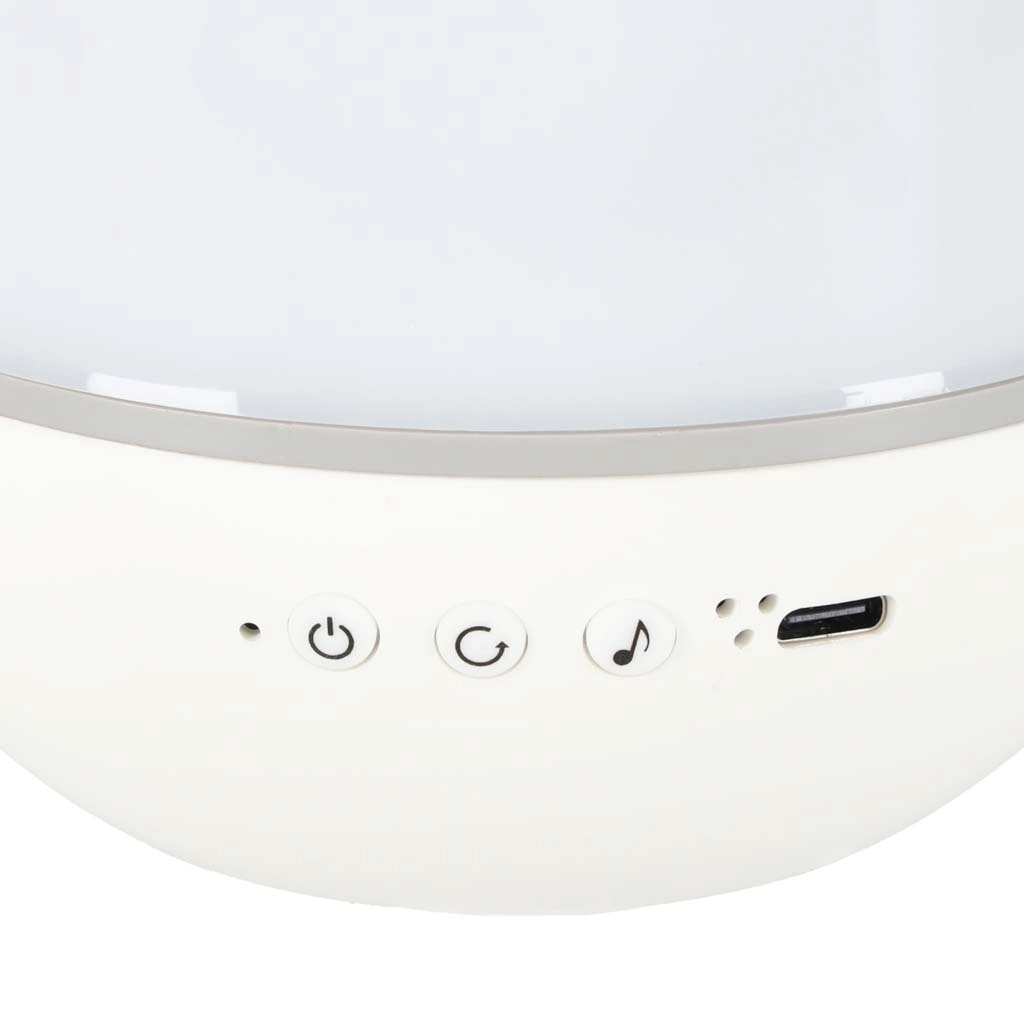 Den praktiske fjernbetjening kan tænde/slukke, ændre farve og lysstyrke, starte/pause musik, styre lydstyrke, aktivere rotation og sætte timer på 15/30 min. Det indbyggede 1200 mAh-batteri giver 4–5 timers drift, opladning via USB 5 V.