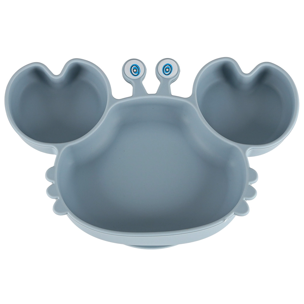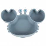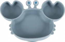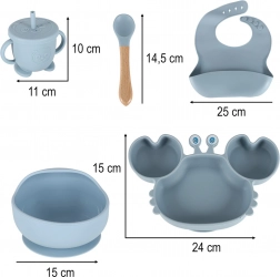 Komplet silikone spisesæt til de mindste med en sød krabbeformet tallerken, skål, kop med to låg og sugerør, bestik og justerbar hagesmæk. BPA-fri silikone, sugekopper mod væltning og nem rengøring gør dette sæt til et ideelt valg til barnets første selvstændige måltider.