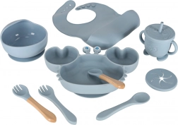 Dette 9-dels silikonesæt dækker alle behov ved bordet: krabbeformet tallerken med rum for bedre organisering, skål og tallerken med sugekop mod gliden, kop med to låg og sugerør, sikkert bestik til små hænder og en vandafvisende hagesmæk med lomme til at fange krummer.