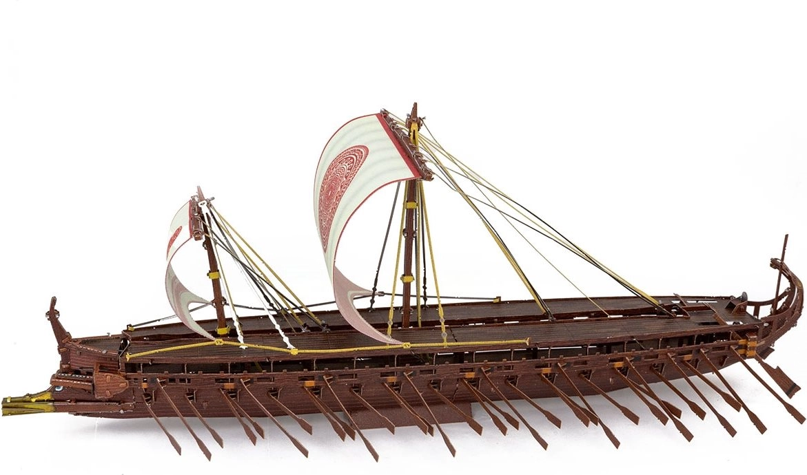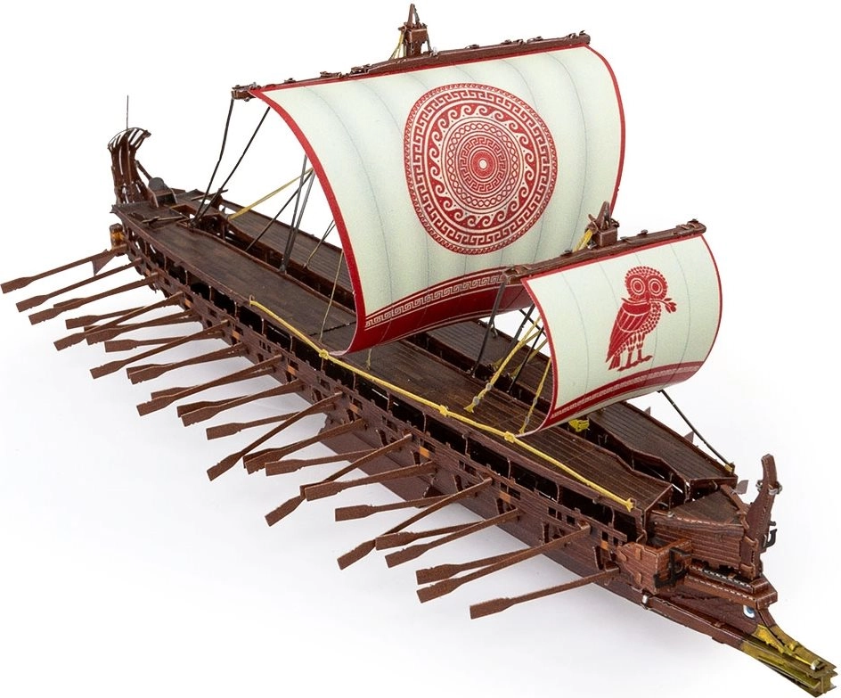 Fine linjer i sejlene, bordlægningen og dæksdetaljerne er udskåret og graveret med høj præcision for et autentisk trireme-look.