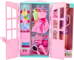 Dette veludstyrede sæt vil glæde ethvert barn, der elsker mode og stil. Den åbne garderobe med hylder gemmer på farverige kjoler, praktiske bøjler, matchende sko og håndtasker. Med spejl og kam kan dukken blive klar til enhver lejlighed. Legen udvikler fantasien, finmotorikken og sansen for farve- og stilkombinationer.