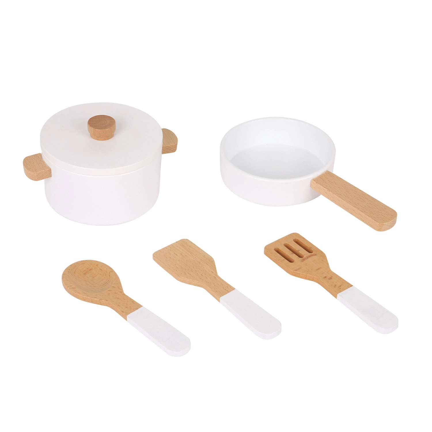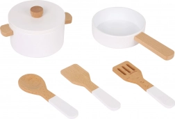 Sættet indeholder alt, hvad små kokke behøver: gylden vask med vandhane, kogeplade med drejeknapper, ovn med gennemsigtige låger, 3 træredskaber, et håndklæde, en saltbøsse, en peberkværn og to gryder med låg. Materialet er lavet af 100% FSC-certificeret træ for sikker og bæredygtig leg.