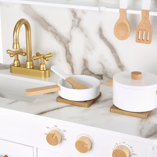 Dette moderne trælegekøkken giver børn en autentisk madlavningsoplevelse i et sikkert og æstetisk design. Det marmorerede look på bordpladen og baggrunden tilfører køkkenet et premiumdesign, der passer perfekt i både børneværelset og stuen. Børn kan lave mad, røre, bage og vaske op og dermed efterligne de voksne derhjemme.