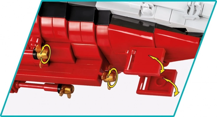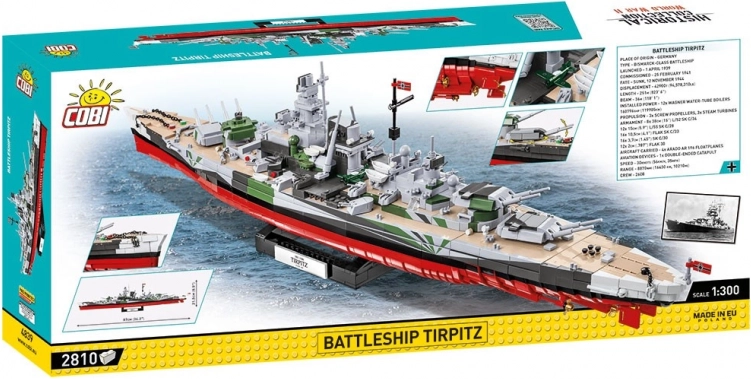 Takket være avancerede byggeteknikker og nye elementer kan du se frem til bevægelige skruer og ror, roterende tårne og løftbare/sænkbare kanonrør. Medfølger gør en robust sort stand med trykt plakette “Tirpitz”. Sættet kræver hverken lim eller maling – alt samles udelukkende med COBI-klodser, som er kompatible med andre mærker.