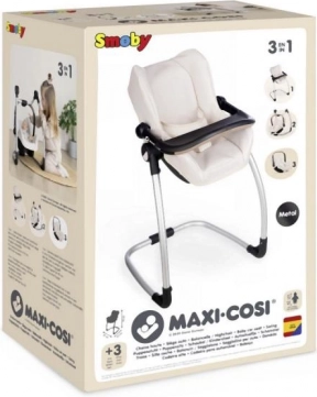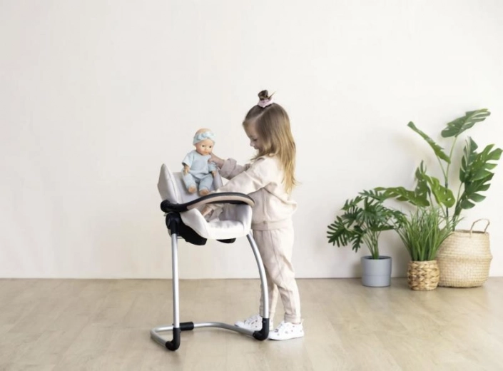 Praktisk 3-i-1 sæt til dukker, der fungerer som autostol, gynge og høj stol. Den omdannes nemt ved at dreje rammen, er velegnet til dukker op til 42 cm og imponerer med et moderne beige design.