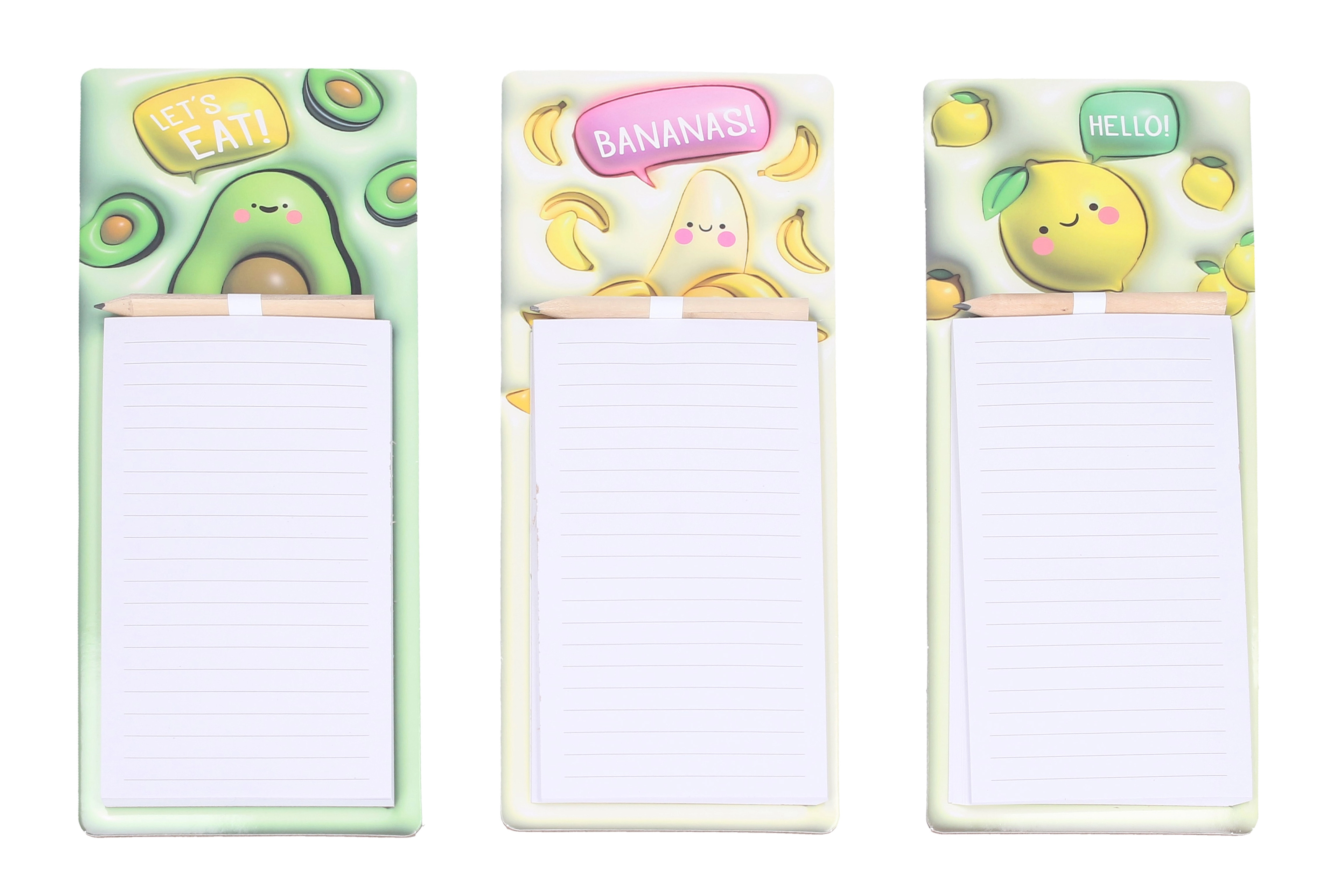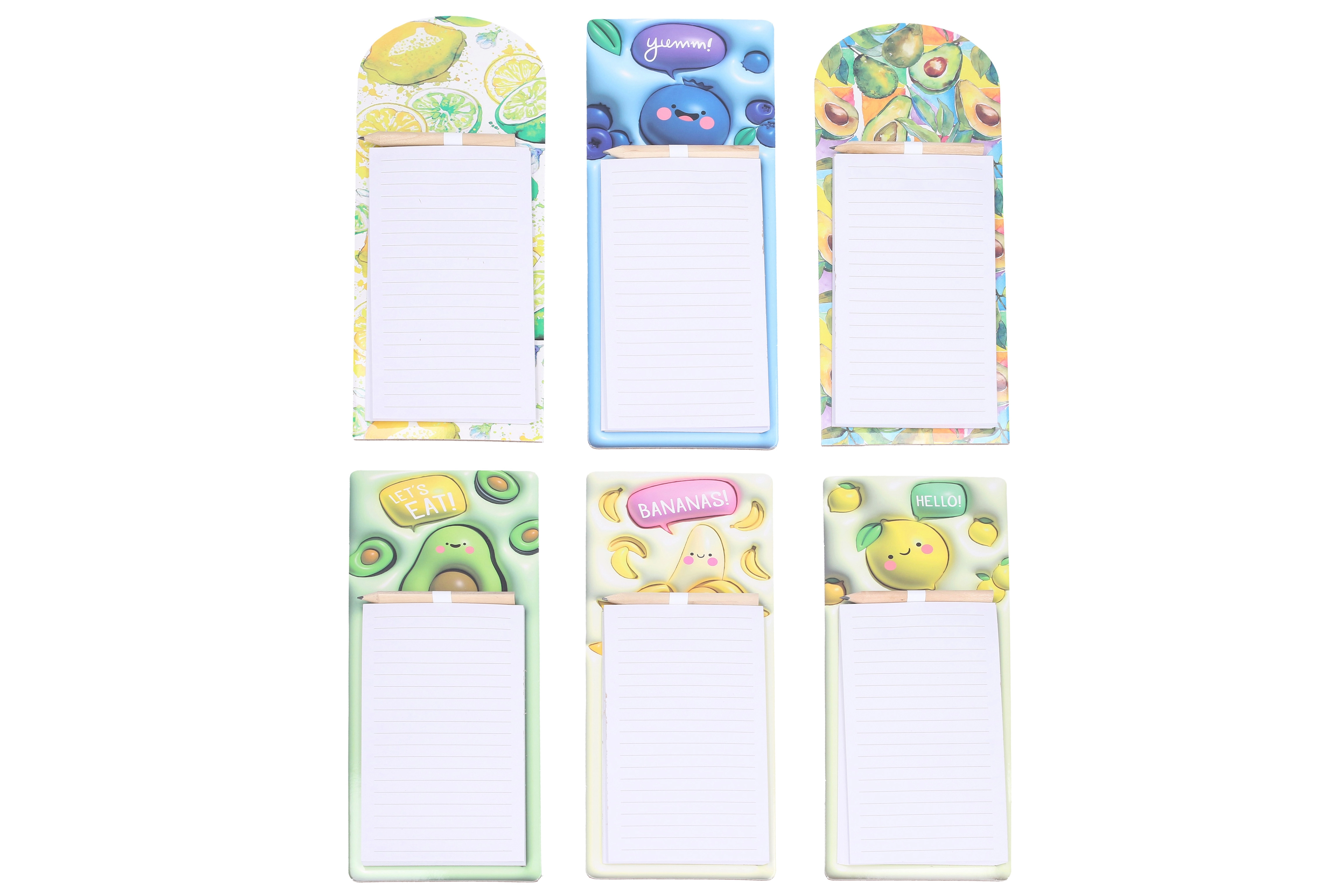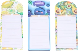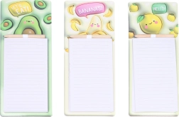 Få styr på indkøb og daglige opgaver med magnetiske blokke med muntre frugtmotiver. Takket være den stærke magnet kan du nemt sætte dem på køleskabet eller andre metalflader, så de altid er lige ved hånden. En praktisk blyant er fastgjort øverst, så du kan skrive når som helst uden at skulle lede.