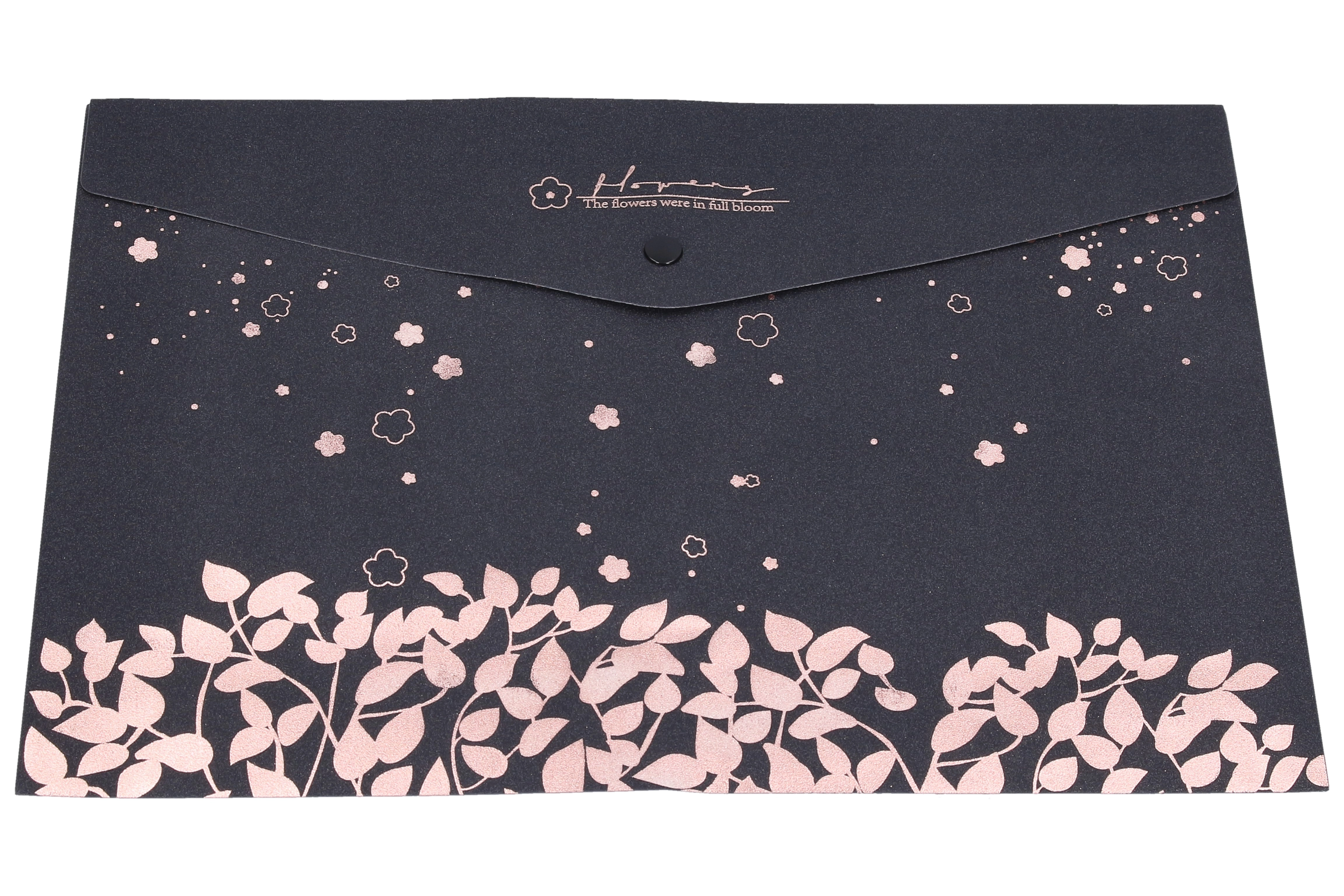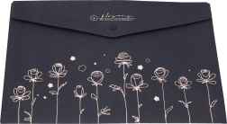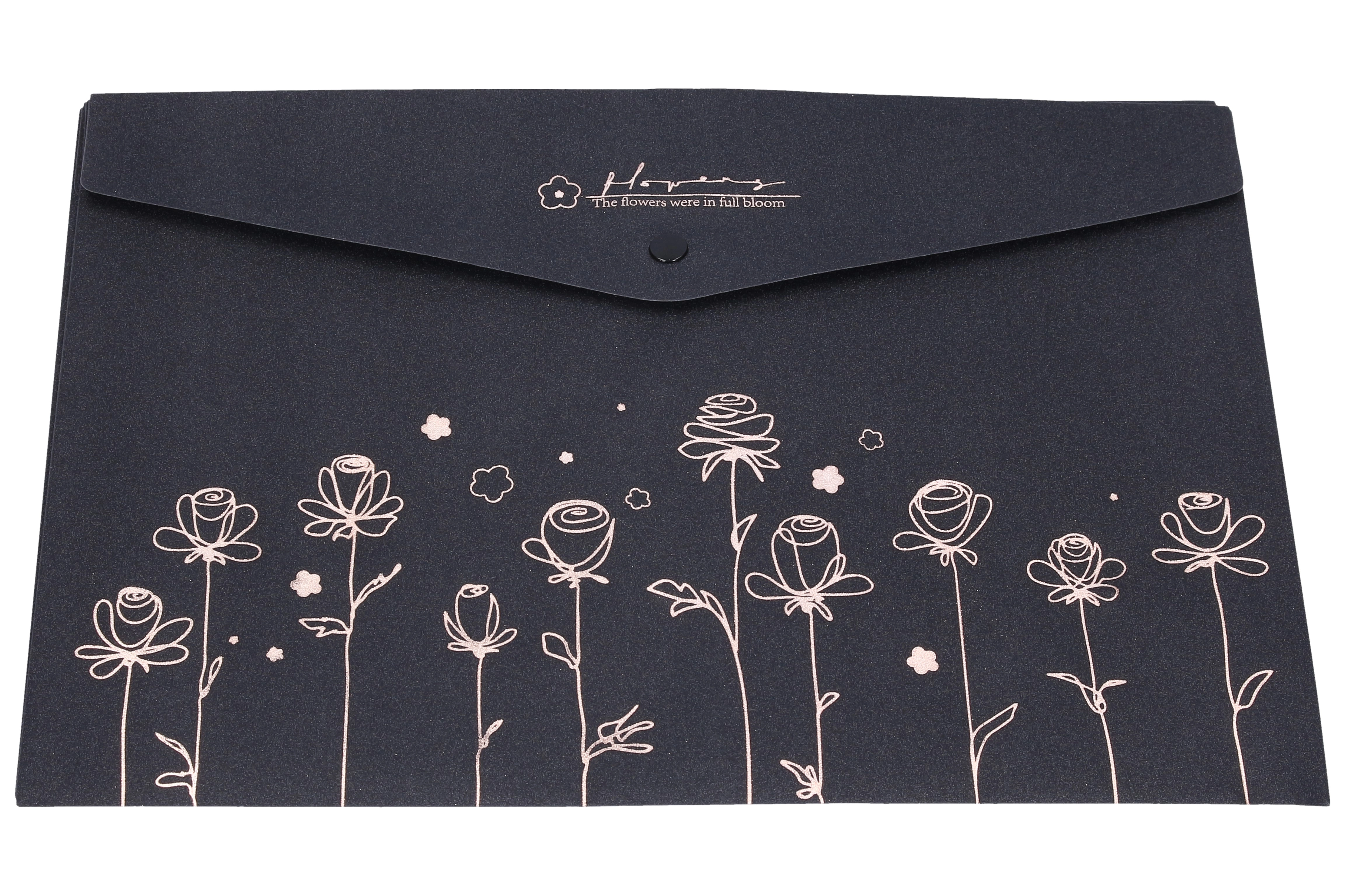 Fine rosa motiver på mørk baggrund giver mappen et moderne og stilrent udtryk, der passer både i skole og på kontor.