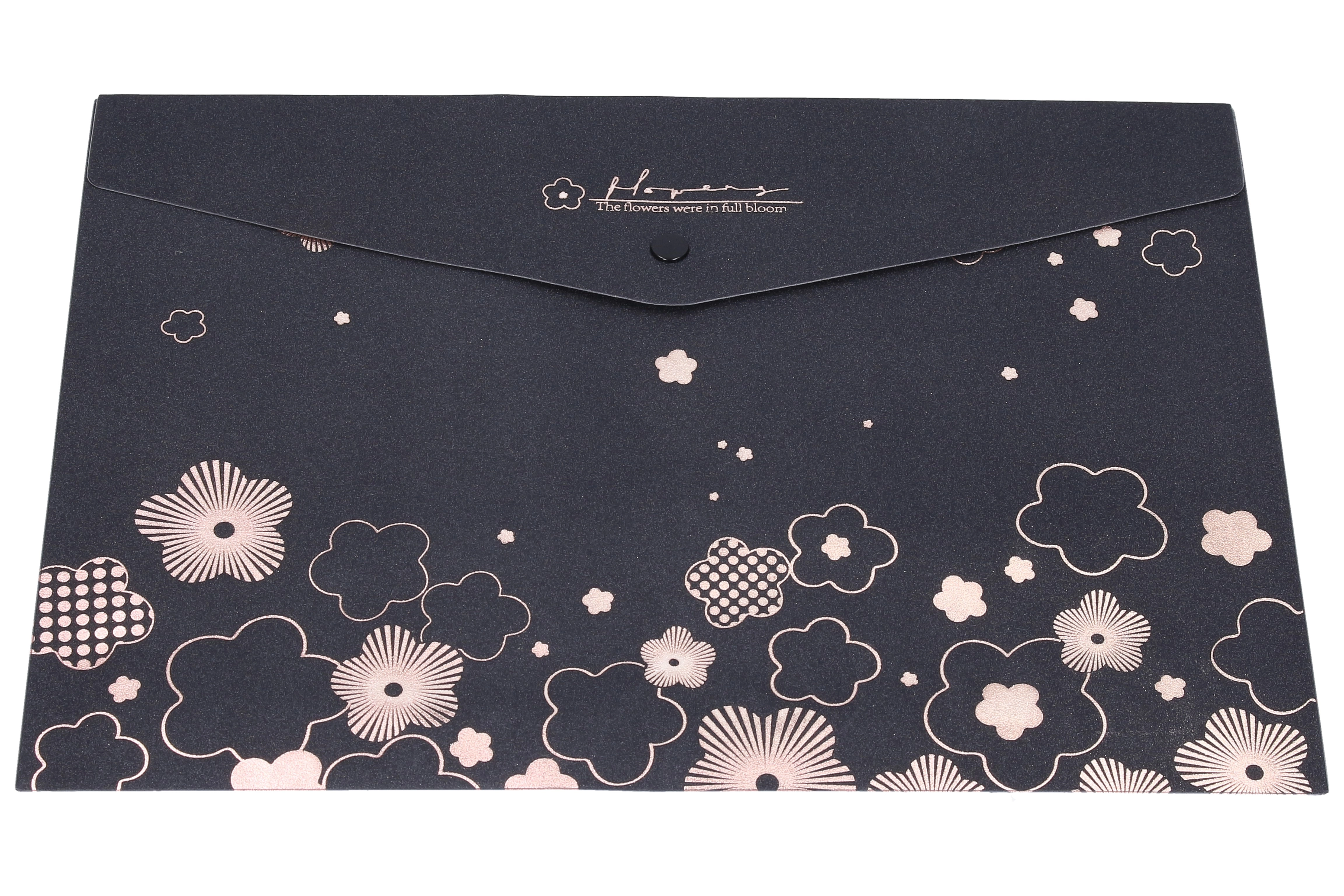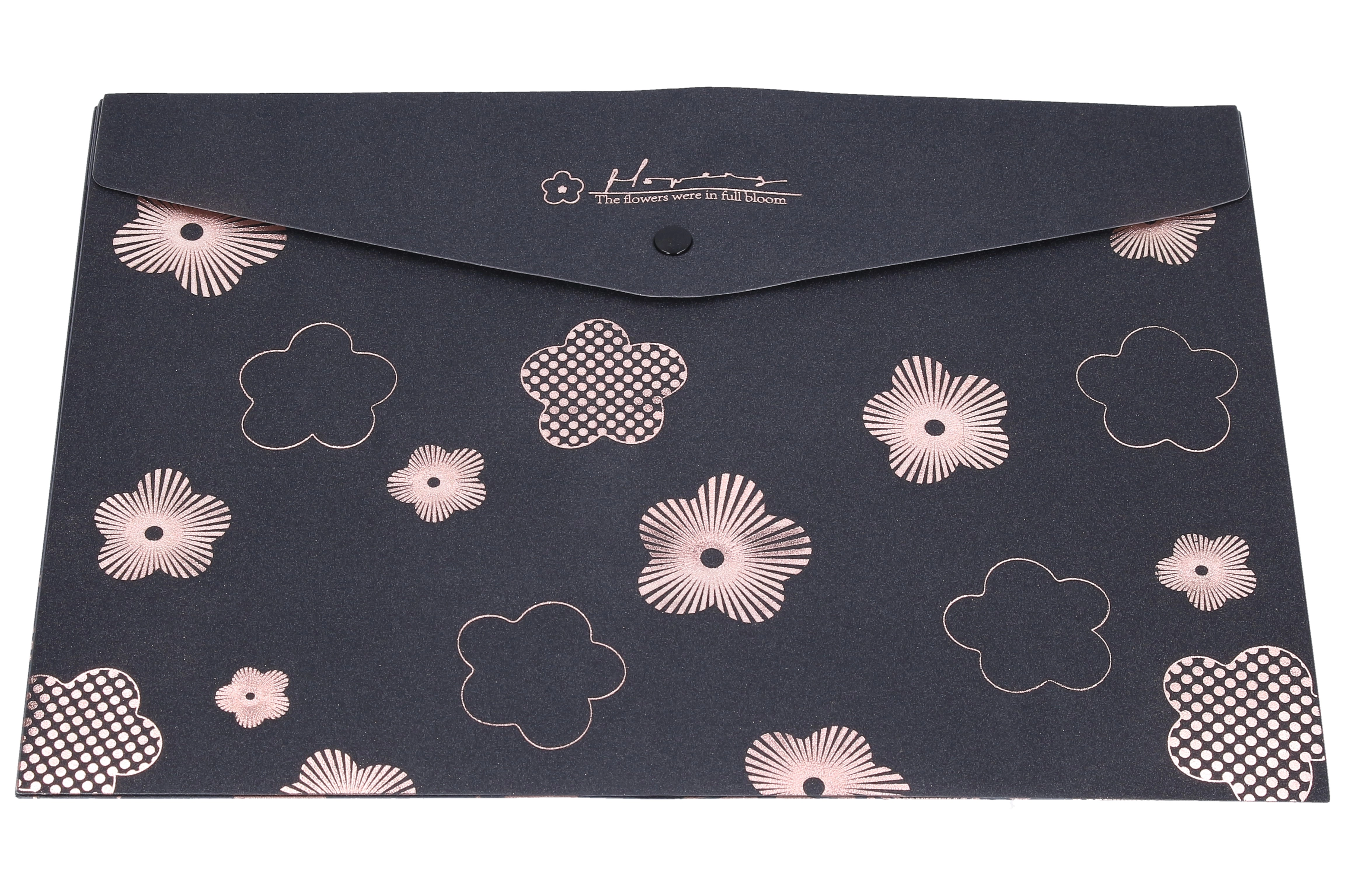 En stilfuld dokumentmappe med trykknap i størrelsen 33 × 23 cm, der holder dine papirer sikre og organiserede ét sted. Det holdbare plastik, den praktiske lukning og fire elegante varianter med et diskret blomstermønster gør mappen til et ideelt valg til skole, kontor og rejser. Sikker lukning, beskyttelse mod krøller og støv samt elegant design til daglig organisering af dokumenter.