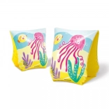 Armringerne har legende illustrationer af vandmænd, blæksprutter og krabber i strålende farver på en gul baggrund, som opmuntrer børnene til at svømme.