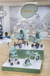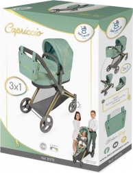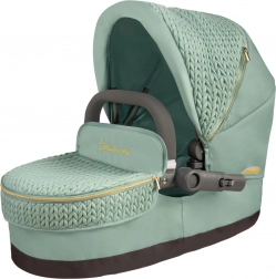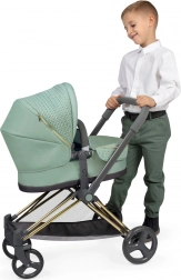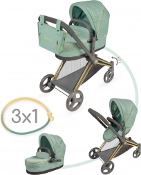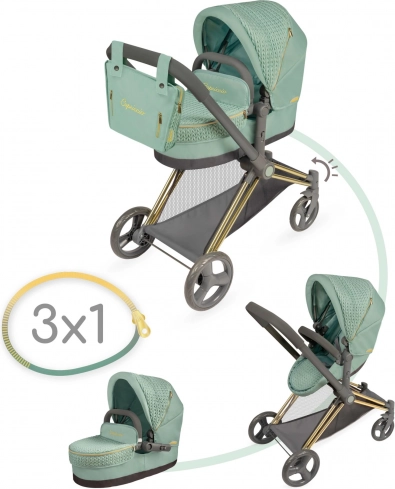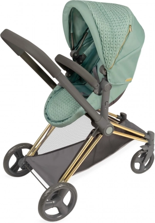 Denne stilfulde dukkevogn skiller sig ud med en kombination af moderne mintgrønt stof og dekorative detaljer, herunder gyldne elementer. Takket være den gennemtænkte konstruktion kan du nemt skifte mellem dyb lift og sportsversion – og tilbage igen. Det højere styr (73 cm) sikrer komfortabel styring selv for førskolebørn.