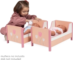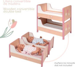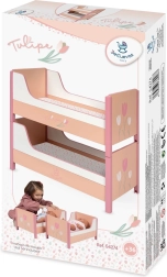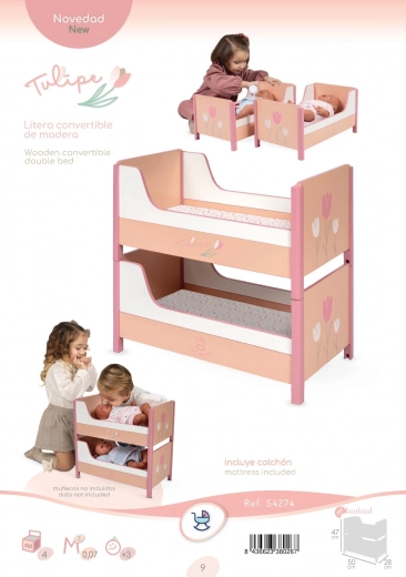Elegant 2-i-1 træseng til dukker fra kollektionen Tulipe begejstrer med blide pastelfarver og blomstermotiv. Takket være den smarte løsning kan den nemt ændres fra en køjeseng til to separate senge. Inkluderer 2 madrasser, kvalitetsforarbejdning og nem håndtering – det ideelle tilbehør til dukkestuen for dukker op til 48 cm.