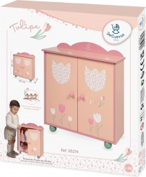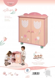 Giv børnene et elegant sted til deres dukketøj. Træskabet fra TULIPE-kollektionen i varme laksefarvede pasteller med et diskret blomsterprint passer smukt ind i ethvert børneværelse. Med tøjstangen og de tre robuste bøjler har små stylister alt ved hånden og pænt organiseret.