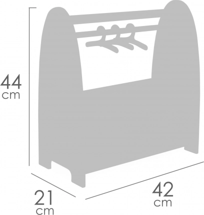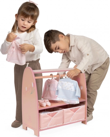Giv børnene orden i dukkernes verden. Dette kompakte garderobestativ i træ fra TULIPE-kollektionen tilbyder en praktisk løsning til ophængning og opbevaring af dukketøj og tilbehør. Garderobestangen med 3 træbøjler rummer tøj op til ca. 19 cm i længden, mens den nederste hylde og 2 foldbare stofkurve holder alt andet lige ved hånden.