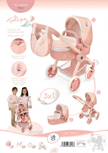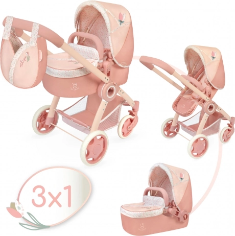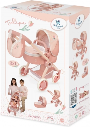Elegant dukkevogn fra Tulipe-kollektionen med 3-i-1 funktioner – liggedel, klapvognsdel og bærebag. Takket være drejelige forhjul, justerbart håndtag på 70 cm og sammenklappeligt stel er vognen let at manøvrere og praktisk på farten. Det stilfulde design i varme pasteller med blomsterprint kompletteres af en aftagelig taske formet som en tulipan og gennemtænkte detaljer for leg med komfort.