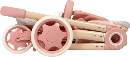 Praktiske detaljer gør hverdagslegen sjovere: drejelige forhjul for jævn kørsel, opbevaringskurv til småting, lomme på kalechen med tekstiltulipan og lille klokke, samt et dekorativt overtræk til liggedelen med velcro og lille lomme. Vognen er sammenklappelig, så den fylder minimalt og er nem at transportere i bil.
