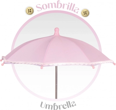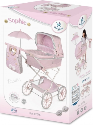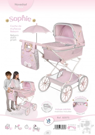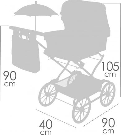 Det rige udstyr omfatter en sammenklappelig parasol, dekorativ aftagelig taske, liftovertræk med trykknapper og lommer, blød madras og tæppe med kort, blød luv. Den praktiske opbevaringskurv nederst giver plads til tilbehør. Den robuste metalkonstruktion i kombination med tekstil og plast sikrer holdbarhed og nem vedligeholdelse. Modellen er let at folde og egner sig til leg både hjemme og udendørs.