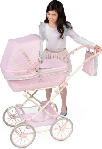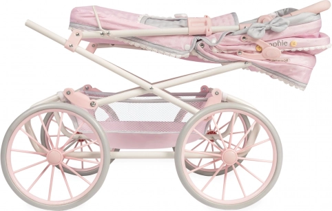 Den stilfulde dukkevogn fra den sarte Sophie-kollektion begejstrer med høj kvalitet og romantiske detaljer i lyserød. Takket være det højdejusterbare håndtag i 6 trin (65–90 cm) passer den perfekt til højere børn og vokser med dem. Fjedrene i understellet giver en behagelig vuggen, mens de store flettede hjul sikrer stabilitet og jævn kørsel.