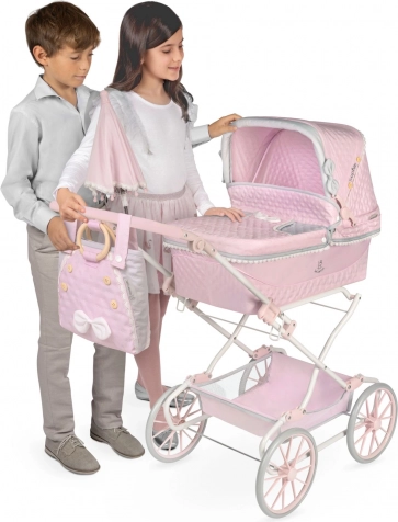 Lyserød udførelse med dekorative sløjfer og blonder. Inkluderer parasol, taske, liftovertræk, madras og blødt tæppe.