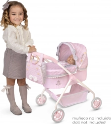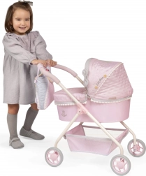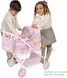 Den charmerende dukkevogn fra Sophie-kollektionen er skabt med fokus på komfort, sikkerhed og nem håndtering. Det lyserøde design suppleres af diskrete grå og hvide detaljer, som understreger den romantiske stil. Takket være det lave håndtag og den lette konstruktion er den særligt velegnet til de mindste piger.
