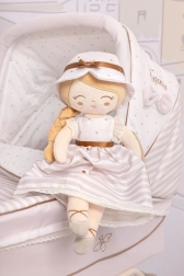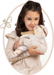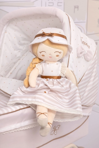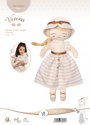 Plysdukke Verona 36 cm er en lille ven inspireret af naturtoner og diskrete mønstre, der giver et tidløst udtryk. Kombinationen af lys beige og hvid med prikker eller striber, suppleret af en fin kant, understreger det elegante spanske design. Dukken er lavet af kvalitetsplys, som er glat og let blank, behagelig at røre ved og egnet til leg hver dag.