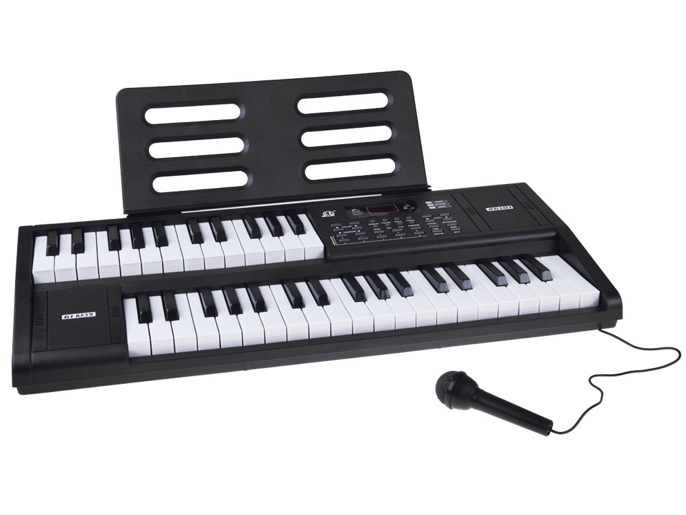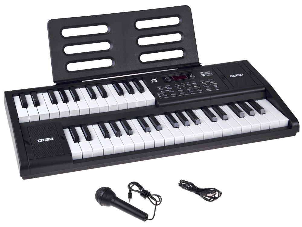 Pakken indeholder en mikrofon og et nodenodestativ. Keyboardet er kompakt med indbyggede højttalere og enkel betjening – ideelt til hjemmemusik, akkompagnementsøvelser og dine første egne kompositioner.
