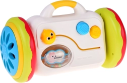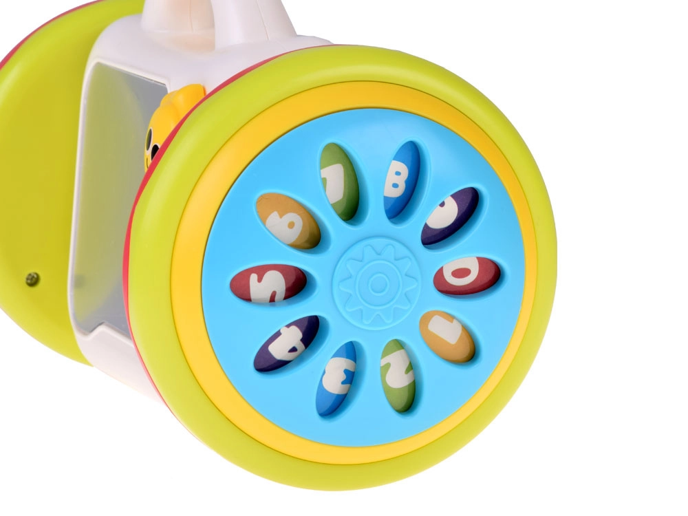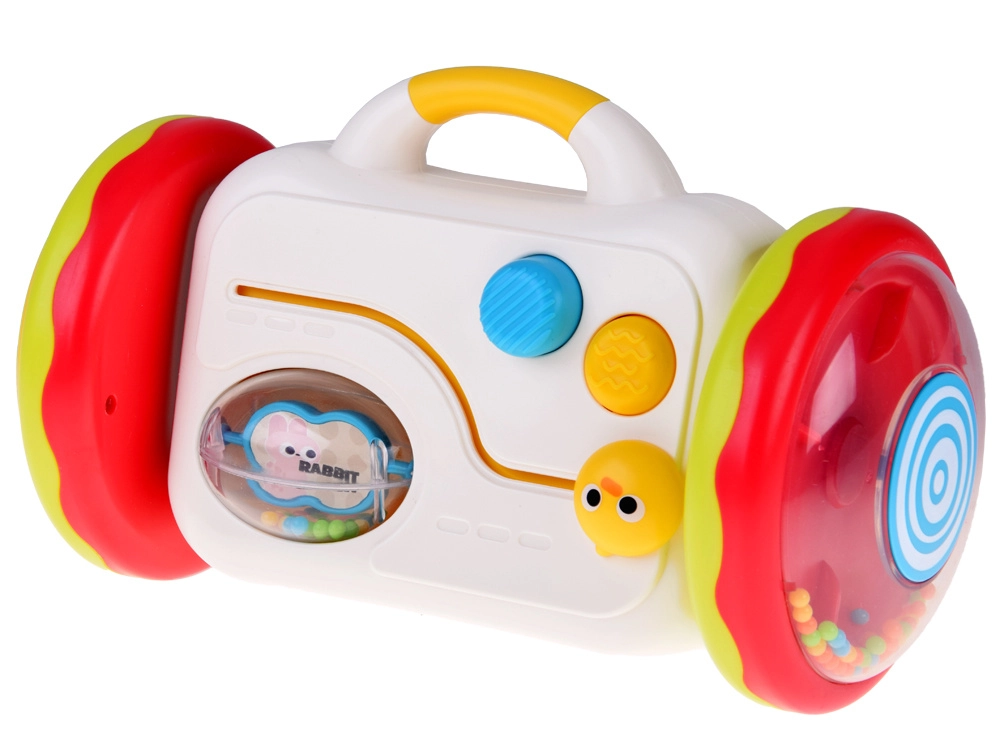 De store farverige hjul gør, at legetøjet ruller jævnt. Barnet vil gerne jage det, kravle efter det og styrker naturligt koordination og stabilitet.
