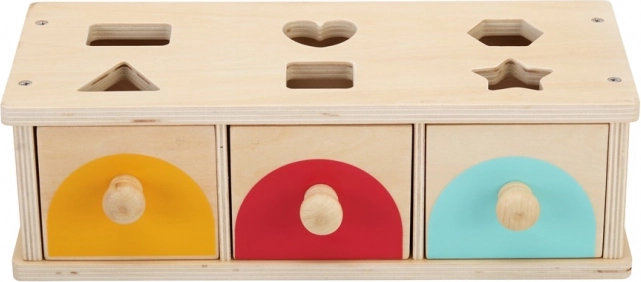 Smart trælegetøj til de mindste, der kombinerer leg og læring. Børn putter farvede former i de tilsvarende huller, og brikkerne glider ned i tre farvemarkerede skuffer. Den øjeblikkelige feedback udvikler forståelse for årsag og virkning, logisk tænkning, hånd–øje-koordination og finmotorik.