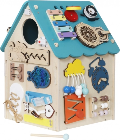 Turkis Montessori-hus fra 2Kids Toys med mange aktiviteter: låse, labyrint, xylofon, ur m.m. Udvikler finmotorik, logik og selvstændighed. 3+.