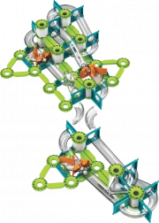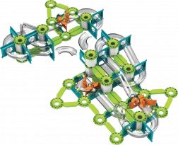 De grønne baner, bærende elementer og orange udløsere forbindes let til stabile spor. Interaktive elementer guider kuglerne gennem sving og fald.